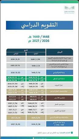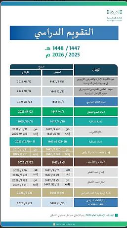 وزارة التعليم بدورها كشفت عن التقويم الدراسي للعامين 1447 / 1448هـ (2025 / 2026م) و1448 / 1449هـ (2026 / 2027م)، متضمن: